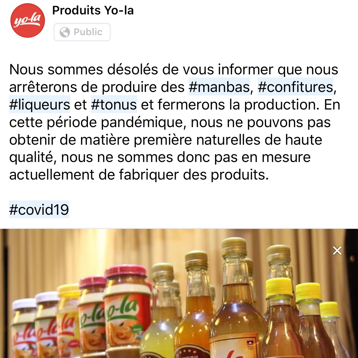 « Nous sommes désolés de vous informer que nous arrêterons de produire des #Manbas, #confitures, #liqueurs et #tonus et fermerons la production. En cette période pandémique, nous ne pouvons pas obtenir de matière première naturelles de haute qualité, nous ne sommes donc pas en mesure actuellement de fabriquer des produits.», peut-on lire.