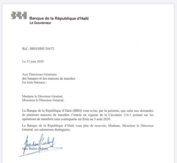 Dans une circulaire datée du 23Juin, la @BRH a décidé de renvoyer au 3 Août prochain la mise en application de la mesure relative au paiement des transferts en gourdes