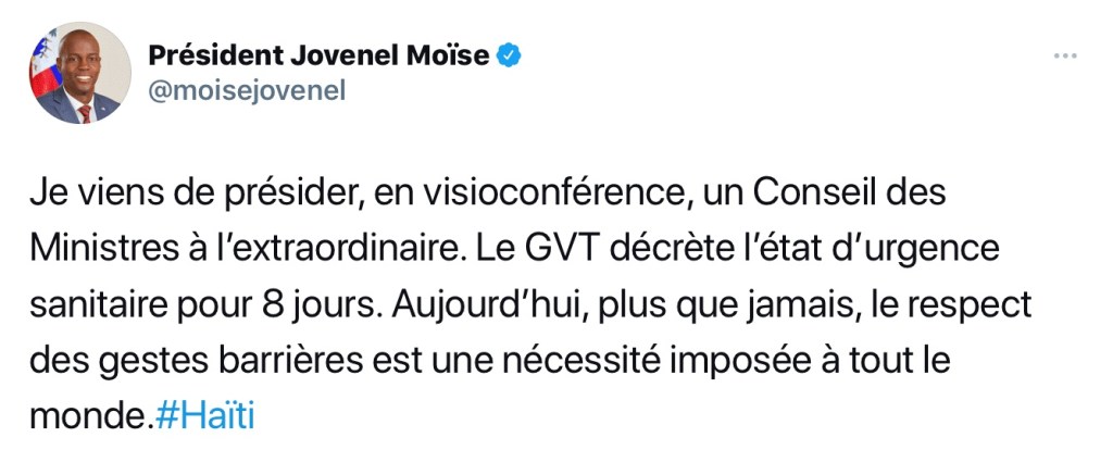 Le gouvernement haïtien a déclaré l’état d’urgence sanitaire, en raison de l’augmentation rapide du nombre d’infections au nouveau coronavirus. Il sera d’application durant 8 jours, a fait savoir le Président Jovenel Moïse dans un tweet récemment publié sur son compte officiel.