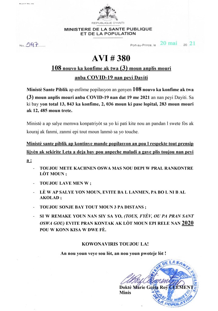 108 nouvelles infections et 3 décès ont été enregistrées ce samedi selon une note du Ministère de la Santé Publique et de la Population (MSPP) sur son compte officiel Twitter.