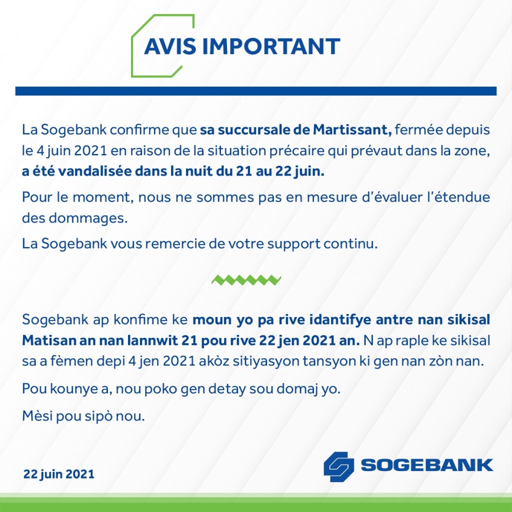 Ce mardi 22 Juin 2021, dans une note publique, la Sogebank confirme avoir été vandalisée dans la nuit du 21 au 22 juin 2021. Dans cette note, elle informe que la dite banque a été fermée depuis le 4 Juin 2021 en raison de l’insécurité régnant dans la zone. Pour l’instant, les dégâts ne sont pas encore évalués et la tension persiste à nouveau.