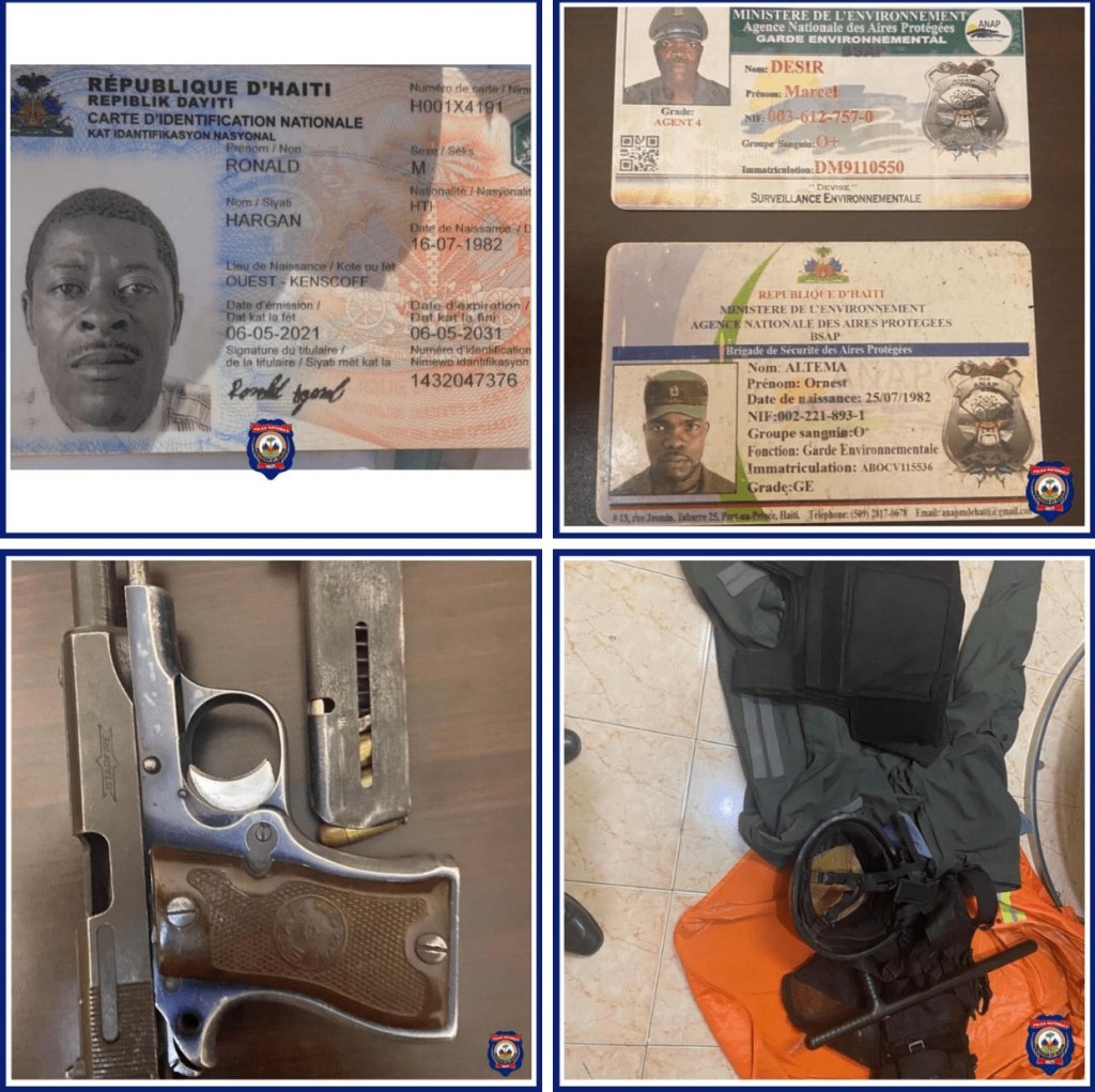 Ces individus avaient en leur possession un pistolet de calibre 3.80mm garni de plusieurs cartouches, a indiqué la PNH qui souligne que la perquisition effectuée à leur domicile a permis la saisie de plusieurs objets dont un IPad appartenant au Citoyen Canadien victime ; Un casque balistique noir; Un gilet par balle; Une Chemise BDU de couleur verte olive; Un pantalon BDU de couleur Verte olive; Un bâton Tonfa noir ; Un gilet tactique noir; Deux cartes d’identification ANAP et BSAP sur deux (02) identités différentes Altema Ornest / Marcel Desir appartenant au ravisseur principal de son vrai nom Altema Onès.