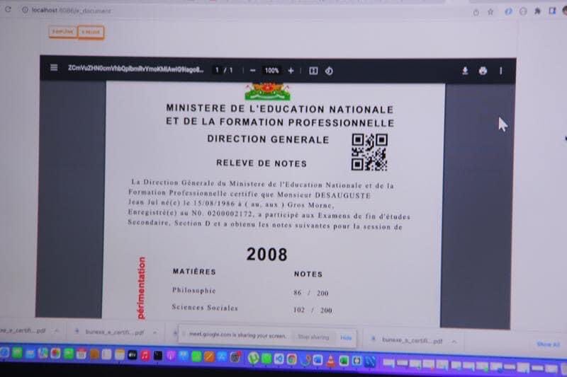 Présentation officielle hier vendredi 18 mars 2022 à la Primature, de la Plateforme E-certificat, un service en ligne du Ministère de l’Éducation Nationale et de la Formation Professionnelle (MENFP) pour la demande et la livraison de relevés de notes et de certificats du baccalauréat.