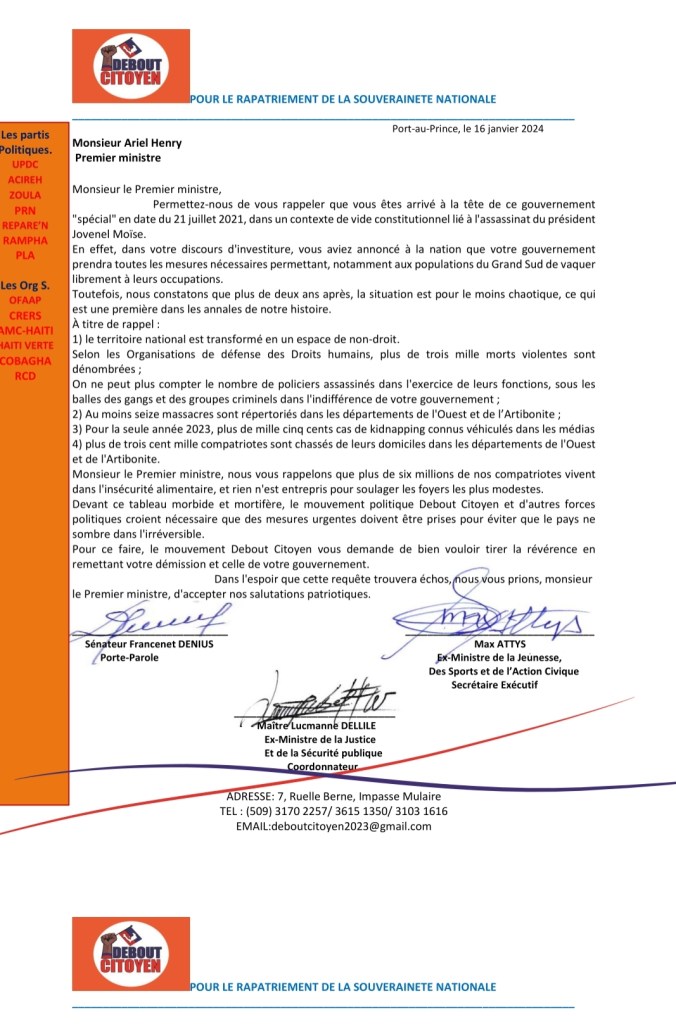 Le mouvement politique Debout Citoyen a dressé un tableau sombre de la situation du pays, plus de deux (2) ans après l’arrivé du premier ministre Ariel Henry au pouvoir. Cette structure demande au locataire de la Primature de tirer la révérence en remettant sa démission et celle de son gouvernement.